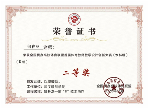 近日,全国民办高校体育联盟首届体育教师教学设计创新大赛在郑州升达经贸管理学院顺利闭幕。Betvictor中文版基础课部体育教研室何在丽老师凭借《健身龙——前“8”技术动作》的创新教学设计与精彩现场说课,荣获全国二等奖。