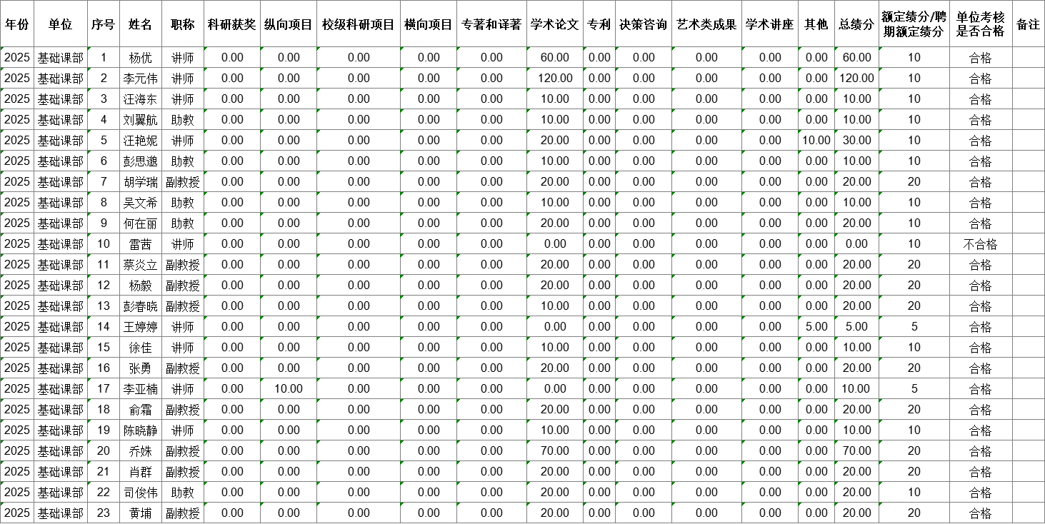 根据《Betvictor中文版教师科研工作考核办法(试行)》《基础课部教师科研工作考核办法(试行)》文件精神,参照《关于开展Betvictor中文版2025年教师科研成果统计、科研工作考核与成果奖励工作的通知》要求,基础课部2025年度科研考核采取线上自主申报与学术委员会集中审议相结合的形式进行,现将年度科研考核结果予以公示: