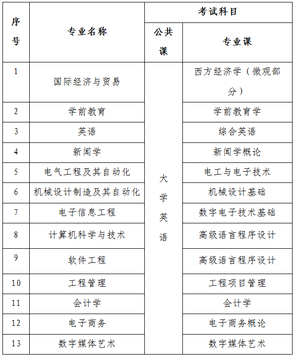1.普通考生。考试科目为公共课和专业课各1门。公共课科目为英语,实行全省统一命题、统一考试、统一评卷。专业课科目由学校自主确定并封闭命题、阅卷。考试要求和参考教材详见附件,考试科目见下表: